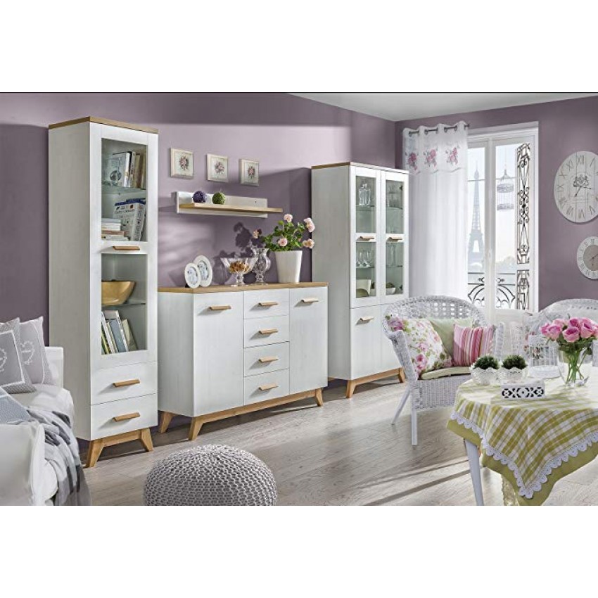 LOTTA is a stylish room system with panels coloured with Andersen Pine and Nash Oak which give it the Scandinavian look. The versatility of elements makes the system suitable for the dining room, bedroom, officeor living room. Handles and legs made of solid wood highlight the luxurt appeal of the furniture. LOTTA Display Cabinet has two drawers for maximum storage and 3 glass shelves inside the glass door cabinet.